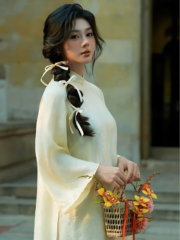 Gái xinh mặc áo dài lụa bên nhành hoa