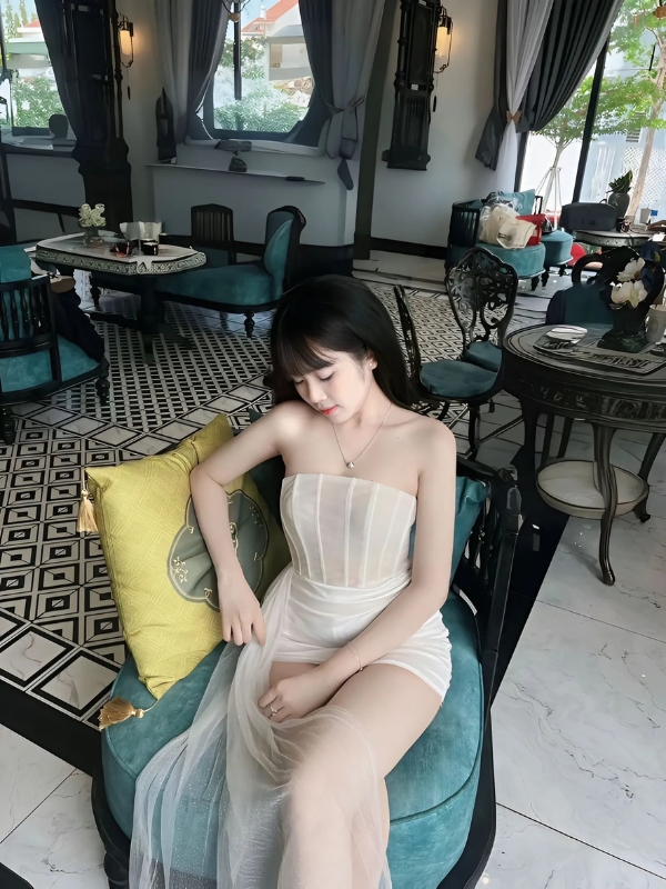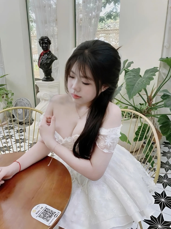 Gái xinh váy trắng trong quán cafe