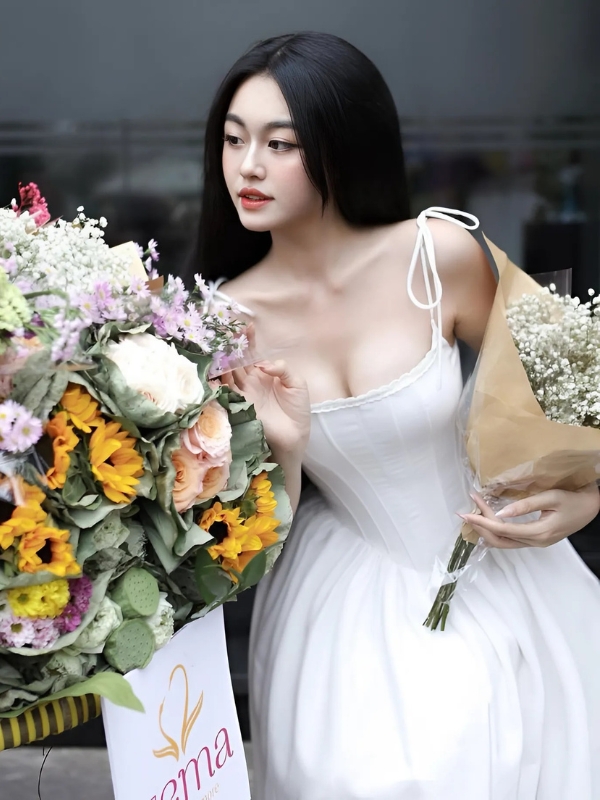 Cô nàng váy trắng bên giỏ hoa tươi